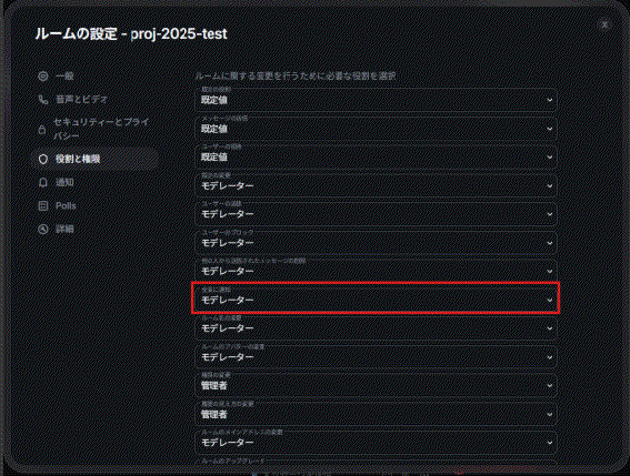 5. 必要に応じて、「役割と権限」から「全員に通知(@room)」等の権限を変更します。一部の設定項目には重篤な副作用が存在しますので、これ以外の権限の値を変更される場合は、システム管理チームにお問い合わせください。この設定画面で「ユーザの定義レベル」に設定しないでください。